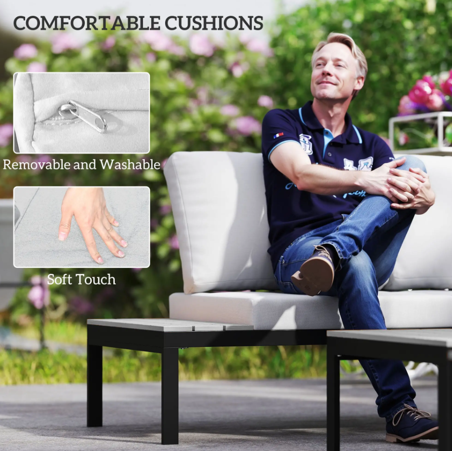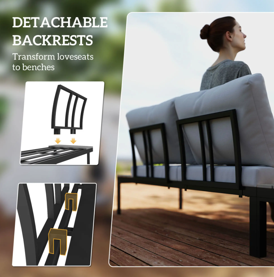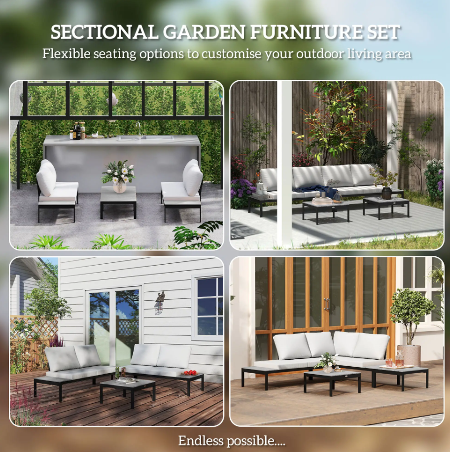 Elevate your outdoor living space with the versatile patio Corner Garden Sofa Set. Perfect for gardens, balconies, patios, or conservatories, this modular outdoor sofa set includes two cushioned loveseats and two matching coffee tables. Easily reconfigure the layout into an L-shape, straight line, or separate seating to suit any occasion.