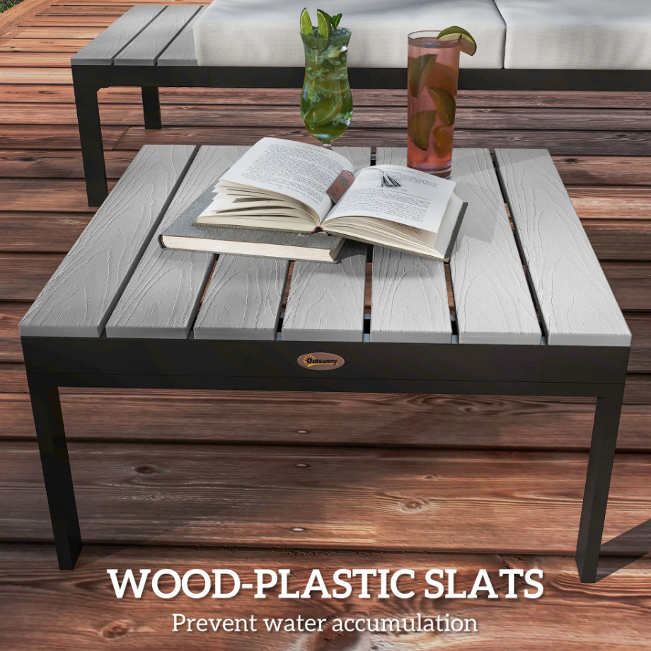 Wood-plastic slatted tabletops prevent water accumulation, ensuring longevity