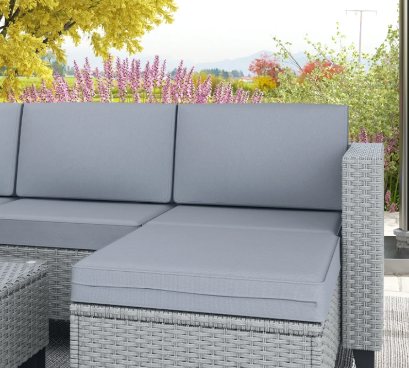 Transform your outdoor space into an inviting oasis with this exquisite garden grey Corner Rattan Furniture. Crafted for both comfort and style, each piece boasts ample seating room accompanied by plush cushions for ultimate relaxation. Engineered with galvanized, powder-coated metal frames, durability is guaranteed, while the chic plastic wicker wrapping ensures protection and charm. Complete with an armless chair, two corner chairs, a footstool, and a glass-top coffee table, this set epitomizes outdoor luxury and functionality. Elevate your alfresco experience with this irresistible ensemble.