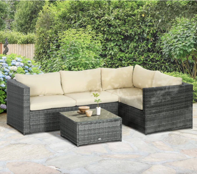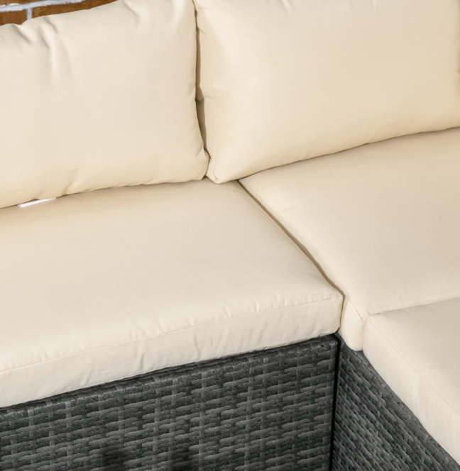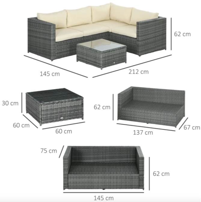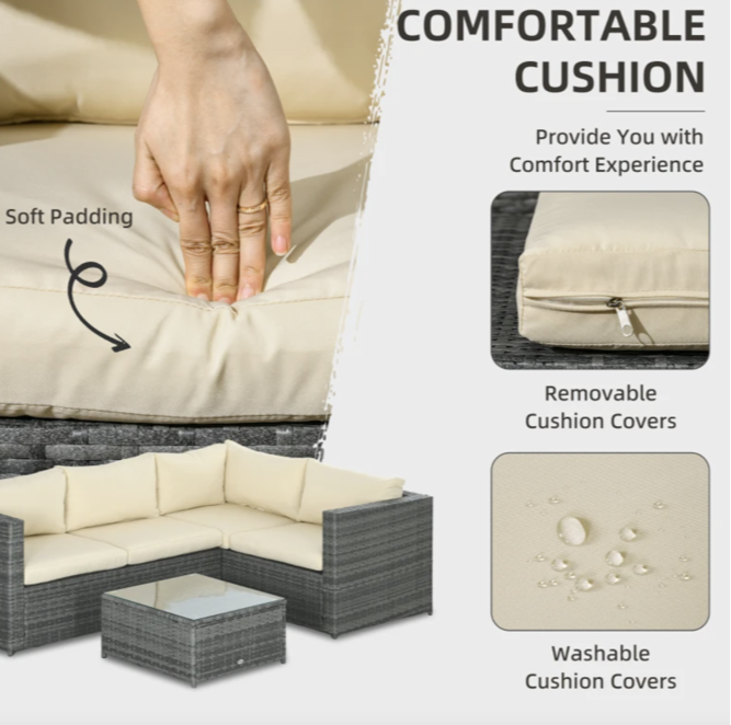 Crafted with a robust metal frame encased in durable plastic rattan, it offers not only a chic aesthetic for your garden but also unparalleled longevity. The set includes two cozy loveseats, each adorned with plush padded cushions for added comfort. To complete the ensemble, a sleek glass-top table is included, adding a touch of sophistication to your outdoor sanctuary. Elevate your outdoor experience and unwind in style with the Corner Rattan Sofa set.