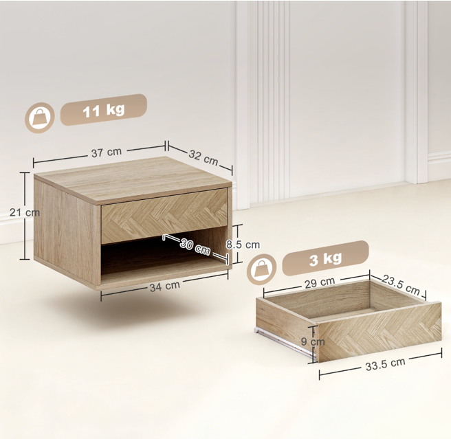 Crafted from durable particle board, each piece offers dependable stability and features a practical design with a single drawer. A convenient bottom shelf, and a spacious flat top to accommodate all your bedtime essentials. Moreover, these tables can be easily wall-mounted, eliminating the need for any floor space and adding a touch of elegance to your bedroom decor. Elevate your bedroom storage with this space-saving and stylish solution.
