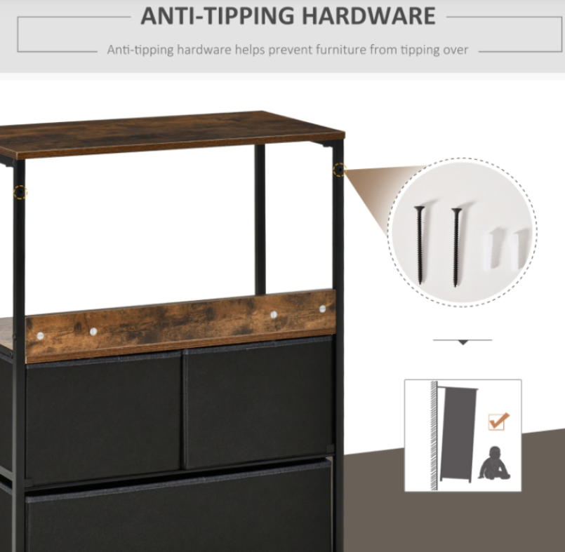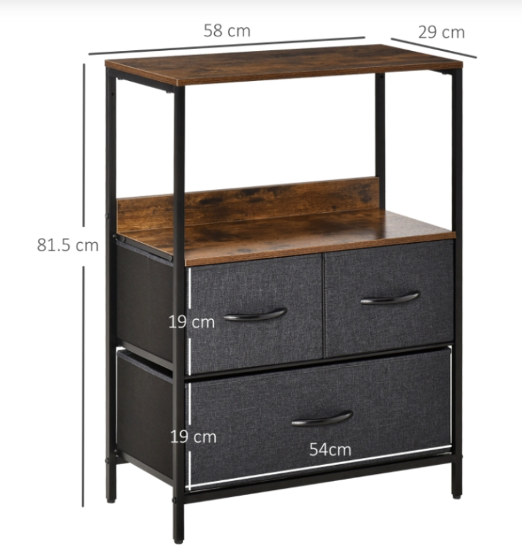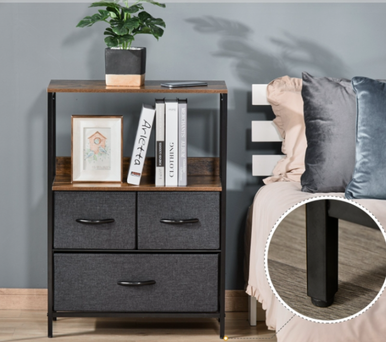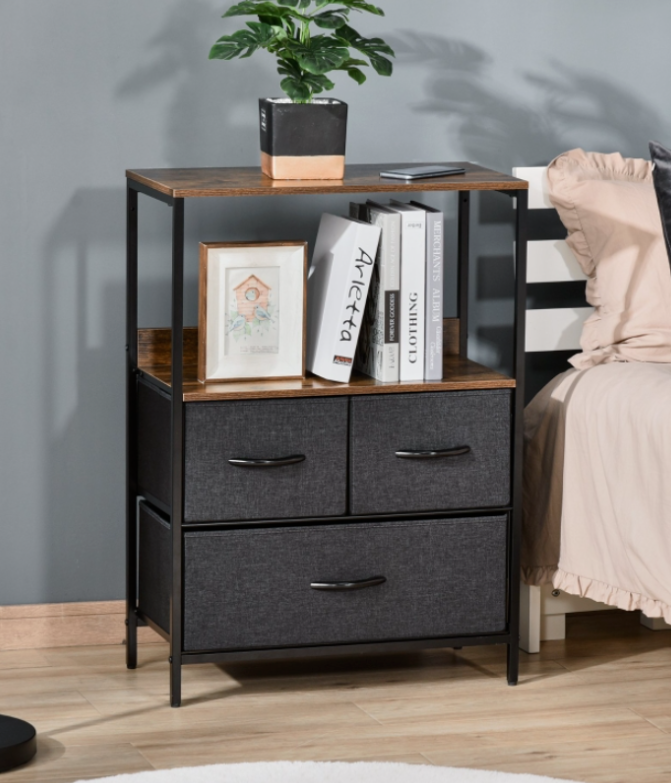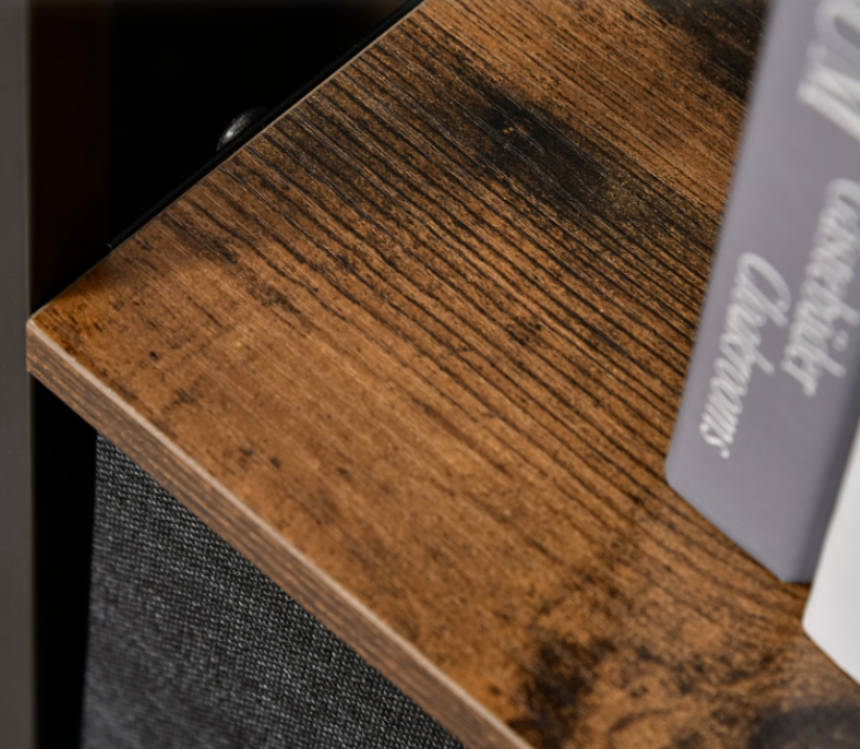 Choose a gentle method for organizing your household items by selecting the fabric drawer Industrial Side Cabinet. This Industrial Side Cabinet consists of two compact drawers and a spacious one, along with two shelves on the top that provide ample storage and display space, respectively. The frame, constructed from sturdy metal, guarantees a solid and stable structure, while the adjustable bottom feet ensure constant balance. To facilitate effortless opening and closing, the drawers are equipped with handles that resemble the appearance of wood.