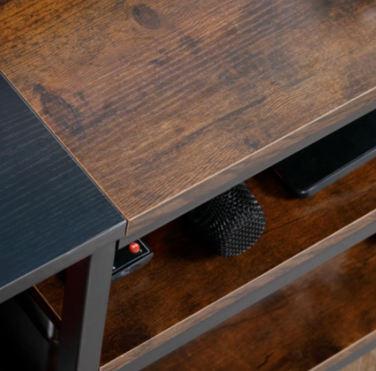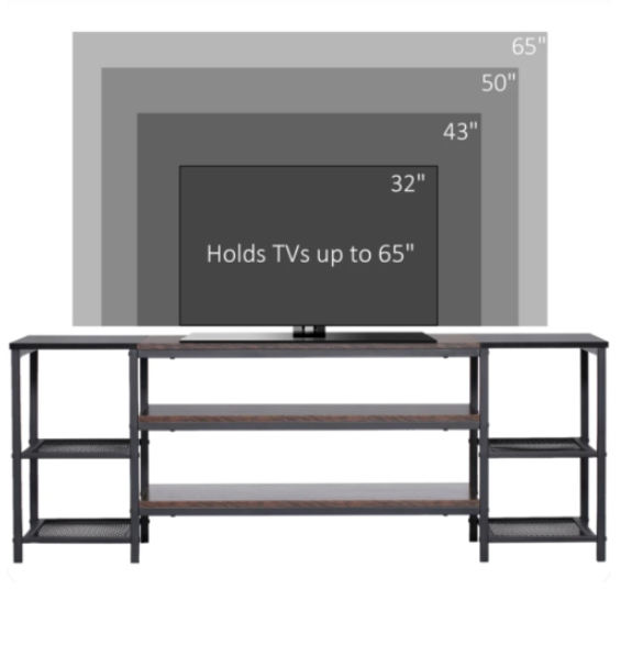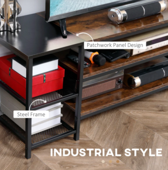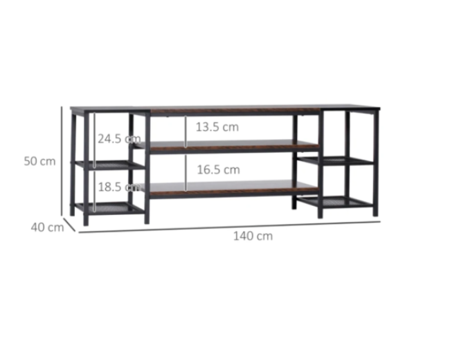 Upgrade your living room with this Industrial TV Stand. It has six shelves and a large table-top: room for holding a TV and all the watching essentials you need. The open shelves of the large Industrial TV Stand are suitable for fitting plenty of differently-sized appliances. The black metal frame means a strong structure, whilst the wood-effect shelves create a striking look for industrial style. A must-have companion for every relaxing moment.