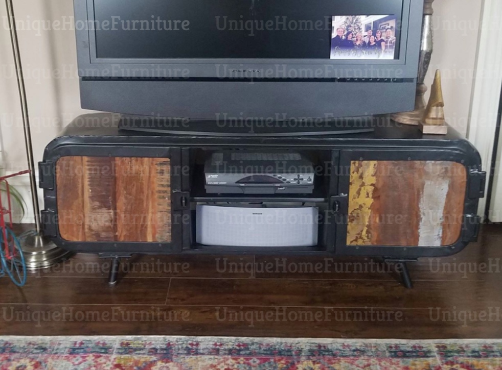 This unique Industrial TV Stand is handmade from solid reclaimed wood and metal been polished, painted and lacquered which is sturdy and durable. This large vintage retro TV stand features two doors and one shelf on the middle of the unit. The craftsmanship and the beautiful wood grains make every piece of this vintage retro furniture unique and slightly different from the next. This Industrial TV Stand supplied flat pack for some easy self assembly, only the metal legs need to be attached all the assembly tools including with the delivery.