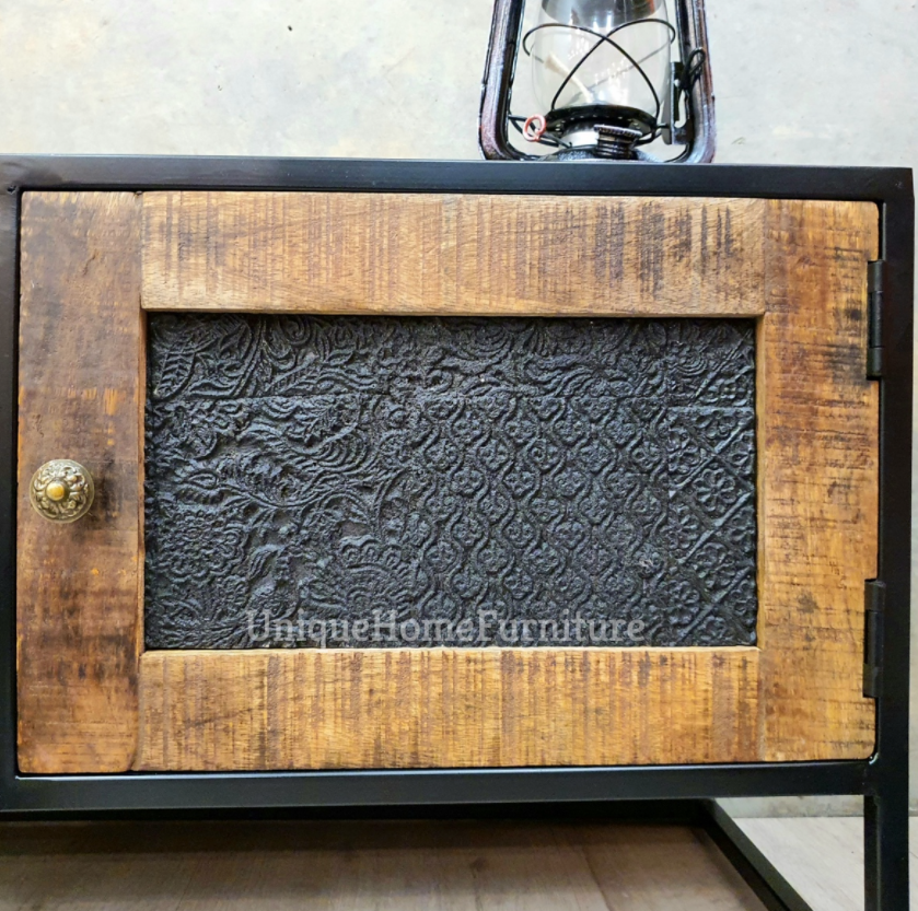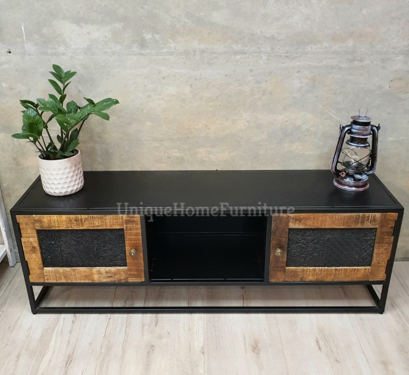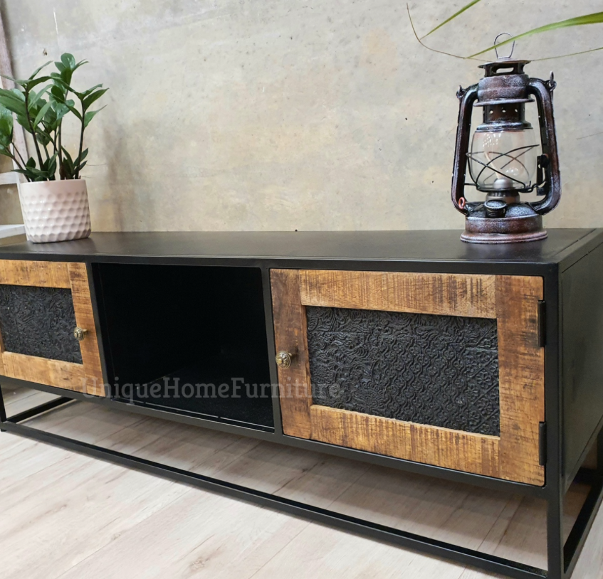 The media unit also features two doors with hand carved pattern and a compartment providing ample storage space. This Industrial TV Stand supplied already assembled!!