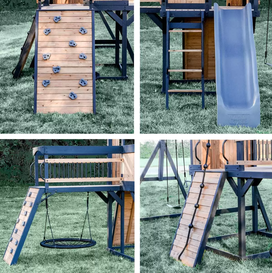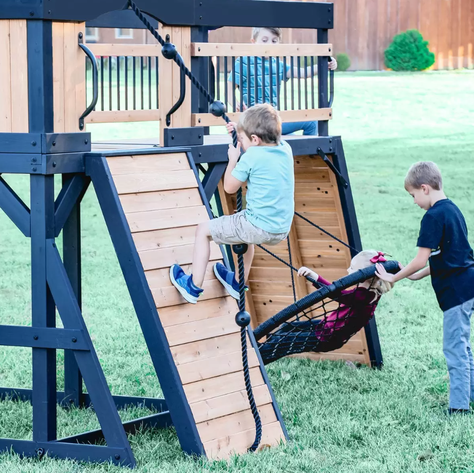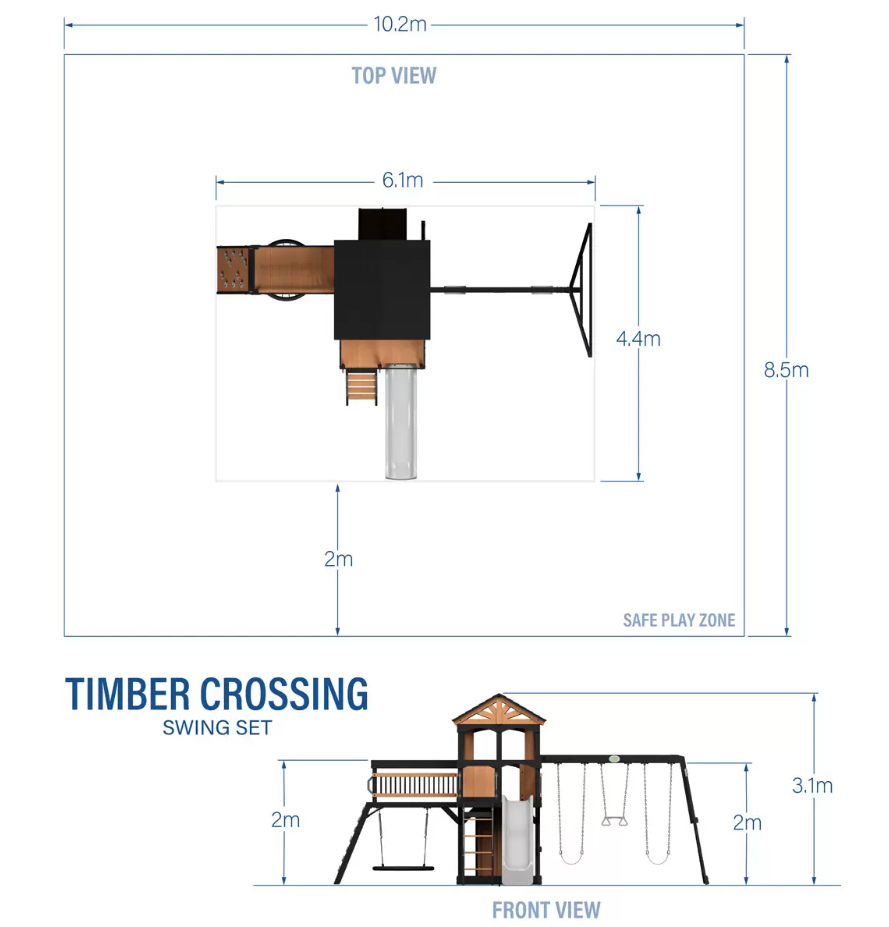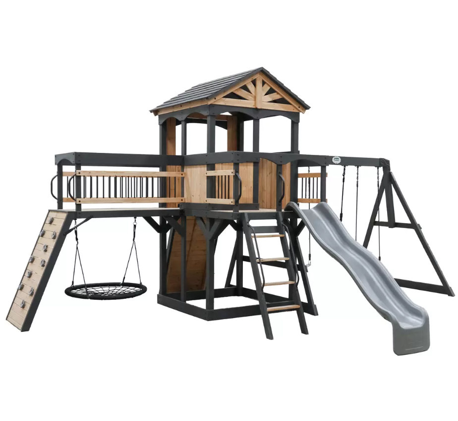 Instead of choosing between exciting features and a stunning design, get both with the Timber Large Garden Playhouse. Redefining play with its eye-catching design, it features a raised clubhouse — complete with a charming front porch and timber bridge — plus a rock wall, zippy slide, 100cm web swing, and more. The kids will have endless hours of fun while you can enjoy a beautiful addition to your garden.