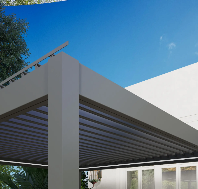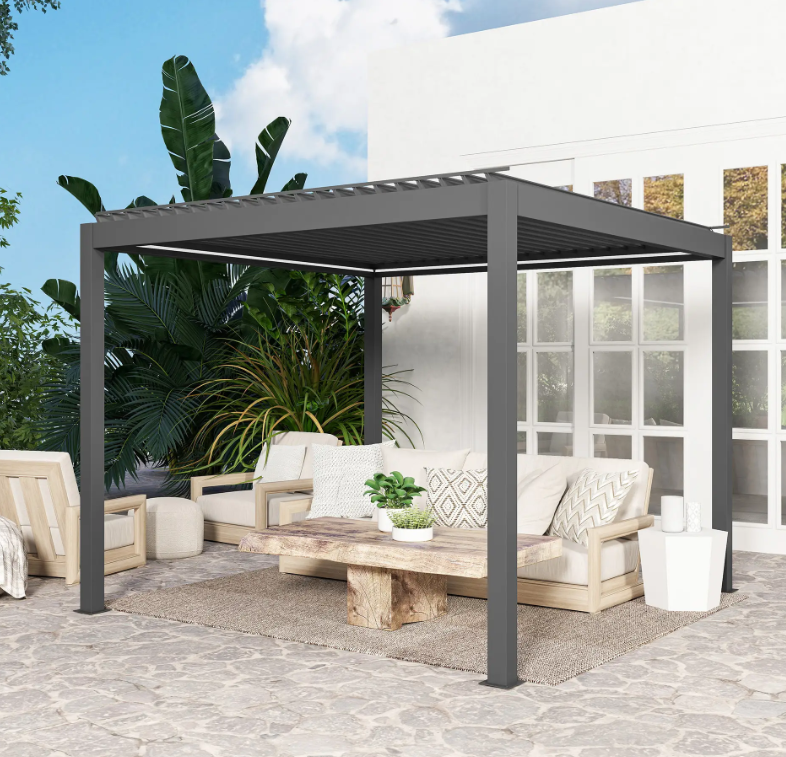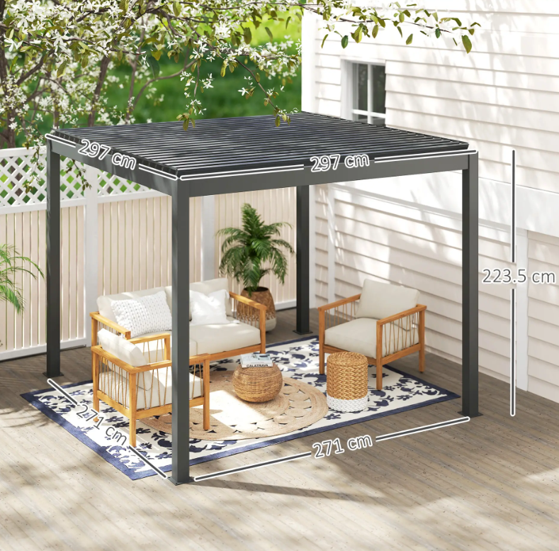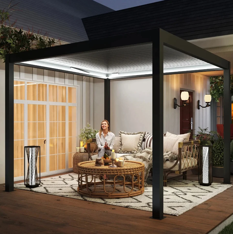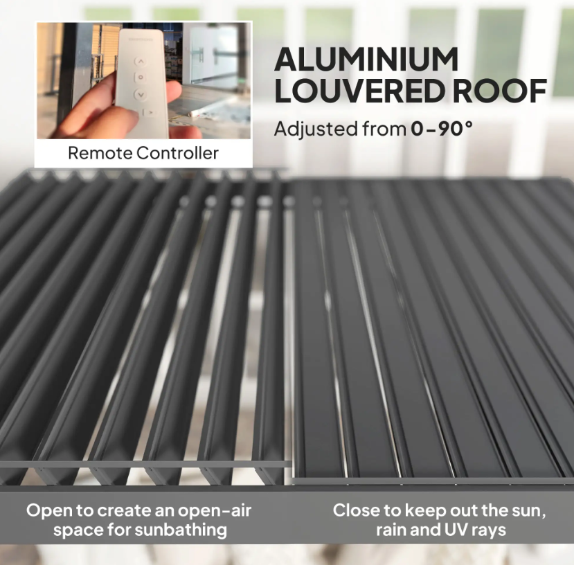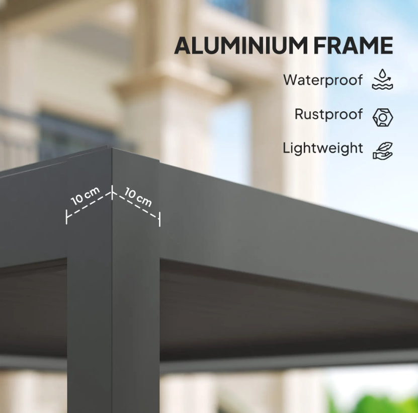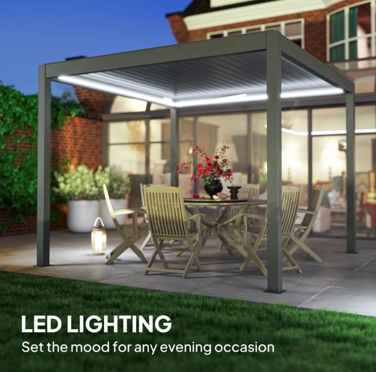 Transform your outdoor space with the modern elegance and functionality of the Large Gazebo Canopy. Effortlessly adjust the roof slats using the remote control to create the perfect balance of sun or shade. As the sun sets, built-in LED lighting adds a warm, inviting glow—ideal for evening gatherings.