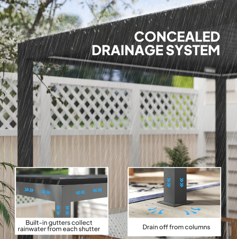 Built-in gutters direct rainwater, keeping area dry and spotless