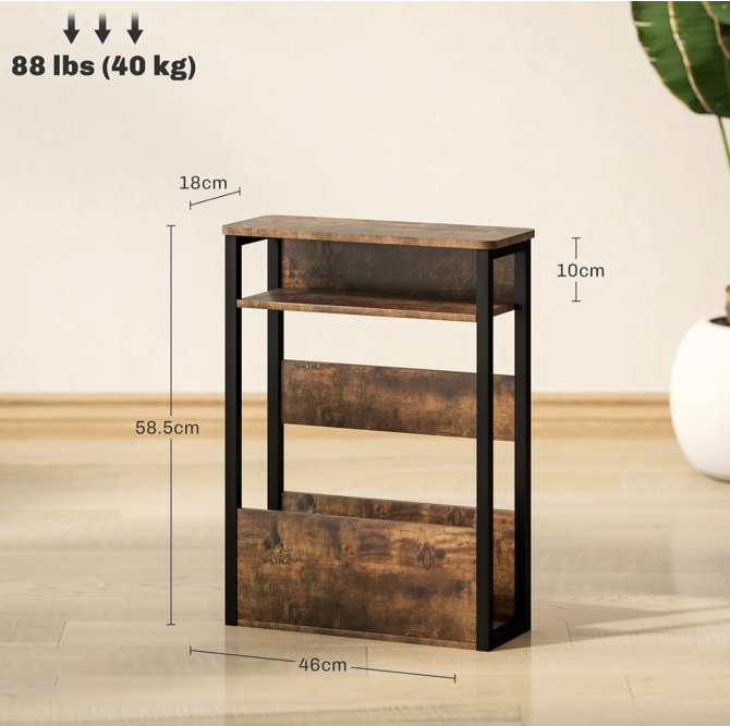 Measuring 18.1 inches in length, 7.1 inches in width, and 24.6 inches in height. This Narrow Side Table with storage boasts a clever and narrow construction, perfect for small spaces. It’s an excellent choice as a sofa end table or a nightstand, ideal for tucking into corners and cozy nooks. Despite its modest size, it offers ample room on the top panel to accommodate a lamp, your drink or books. The lower storage area keeps your belongings neatly organized, from phone and remote controls to books, papers, or magazines on the wooden rack featured at the bottom.