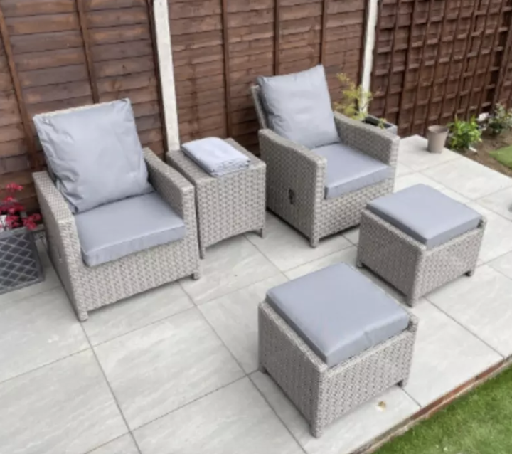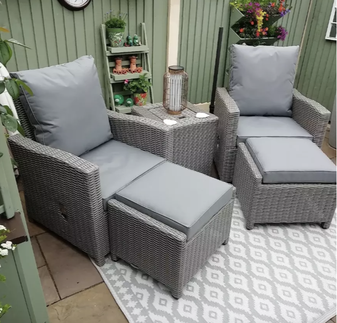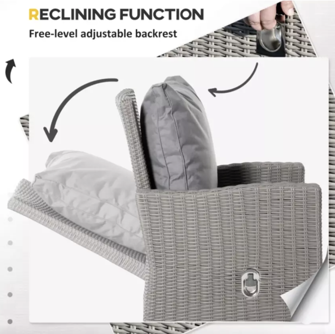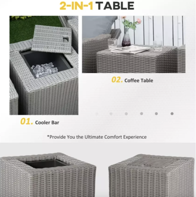 Indulge in ultimate relaxation with this luxurious 2-seater Rattan Bistro Set. This versatile ensemble comprises two reclining armchairs, two footstools, and a coordinating coffee bar table, providing ample seating and convenience for outdoor gatherings. Crafted from durable handwoven PE rattan with an aluminum frame, each piece of this Rattan Bistro Set offers exceptional sturdiness, weather resistance, and easy upkeep. The innovative coffee table features an integrated cooler, keeping your refreshments chilled and protected from pests. Plus, the plush cushions ensure unrivaled comfort, allowing you to unwind in style. Elevate your outdoor living space with this premium Rattan Bistro Set.