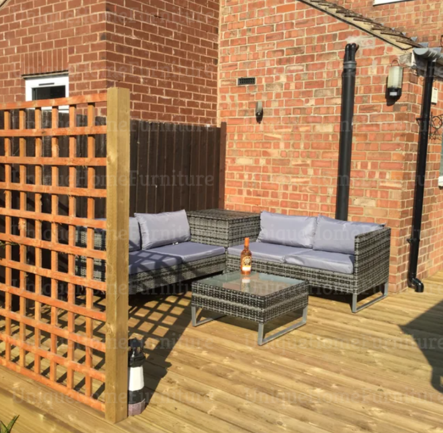 Let this Rattan Lounge Set take the lead for your outdoor comfort this season. It consists of 4 pieces – 2 two-seater sofas with 1 small end wall on each, a storage trunk and a small coffee table. Each piece constructed using a powder coated metal frame for strength, with PC wicker wrapped on top for weather-resistance, with thick grey cushions on the seats and backs for all-day comfort. Tall in height, the corner trunk provides lots of storage room to keep your garden tidy. This Rattan Lounge Set supplied flat pack for self assembly.