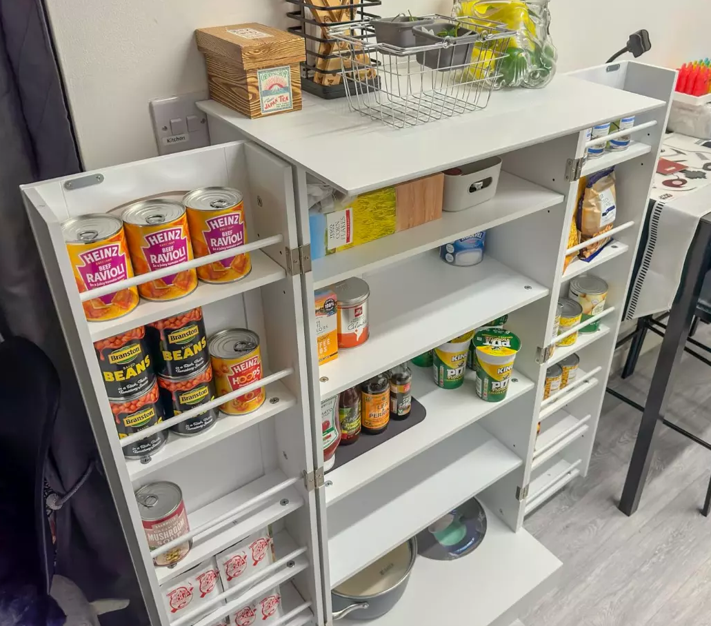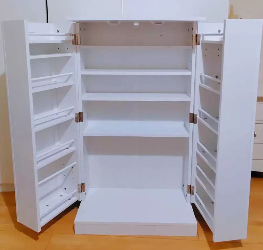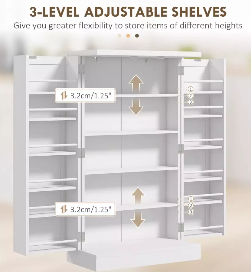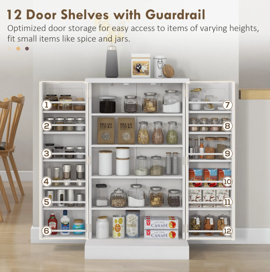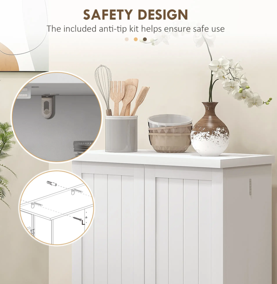 On each side, six-tier door racks with secure support bars ensure your jars, bottles, and essentials stay in place, even when opening or closing the doors. For added stability, this Small Kitchen Cupboard comes with anti-tipping straps, keeping your home safe and organized. Upgrade your kitchen storage today!