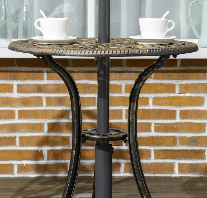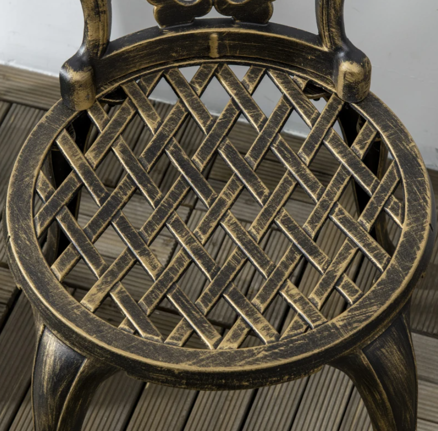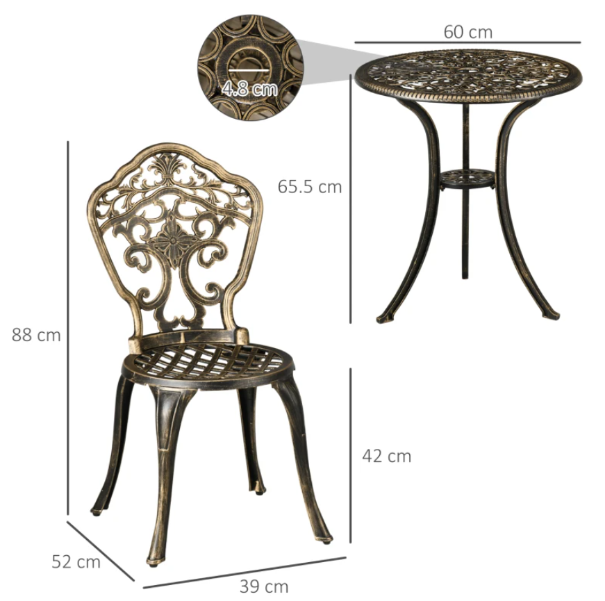 Add some continental elegance to your garden or patio with this stylish and classic Bronze Vintage Bistro Set. Including 2 chairs and a matching table. This Vintage Bistro Set is perfect for dining or drinking in the fresh air. Hand crafted from solid cast aluminium and designed in an exceptional shabby chic style, it will enhance your outdoor experience and bring a style to your garden.