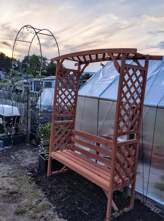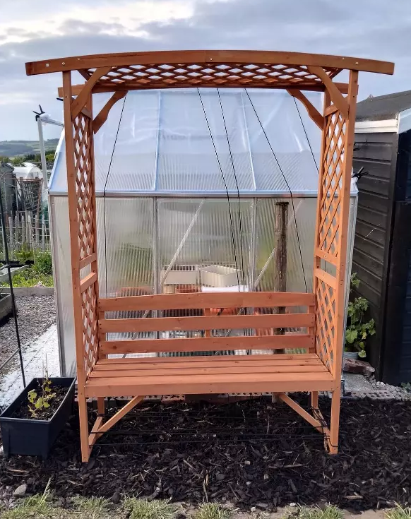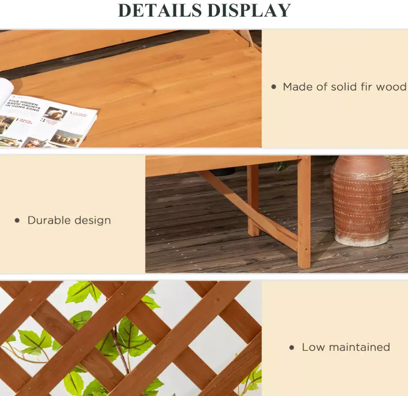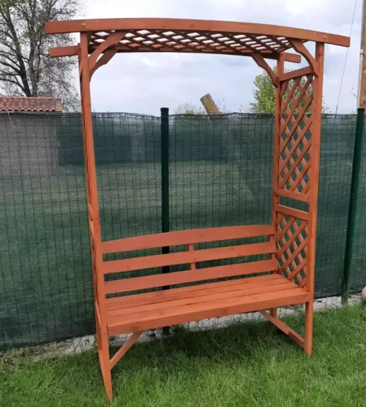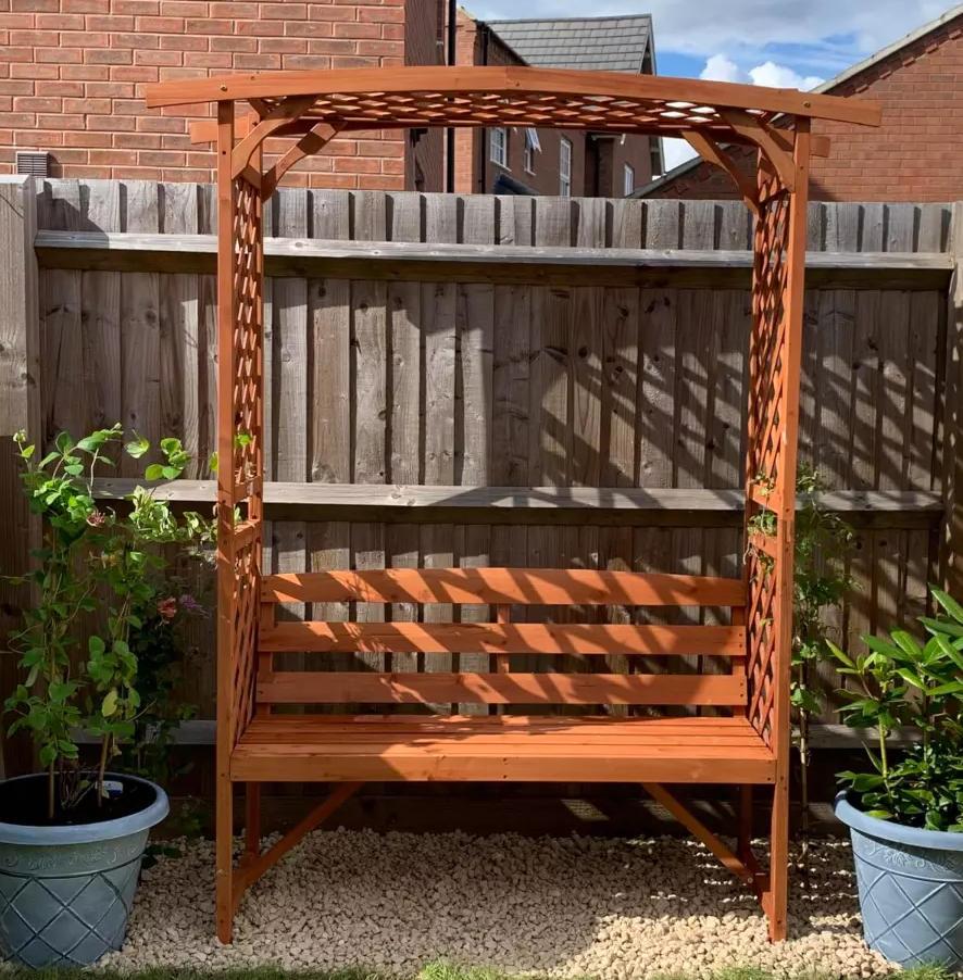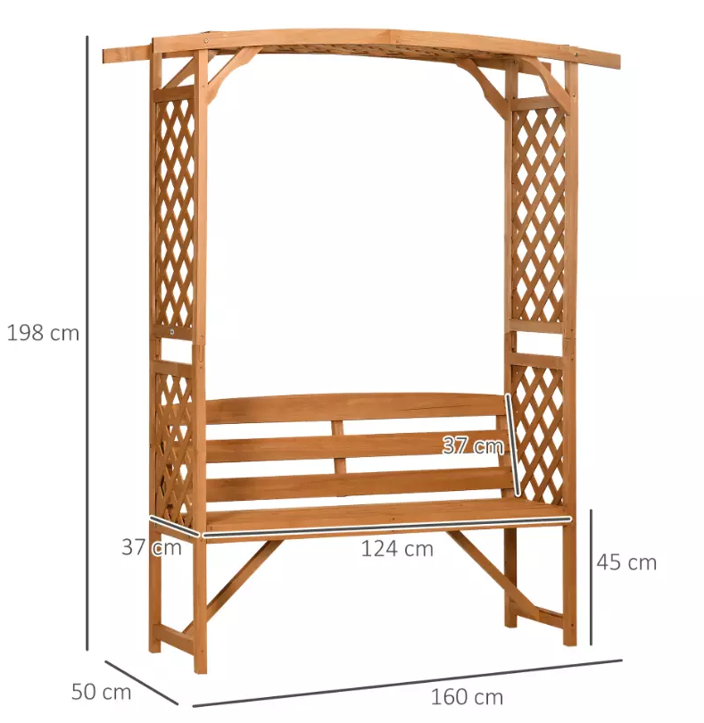 The trellis-style sides encourage vines to grow, blending nature seamlessly into your seating area.Crafted from durable fir wood with a protective varnish coating, this sturdy Wooden Garden Arbour Bench Seat built to last. Keep its natural finish for a rustic look or customize it with paint to match your garden’s aesthetic.