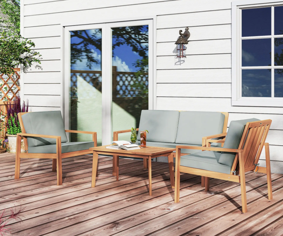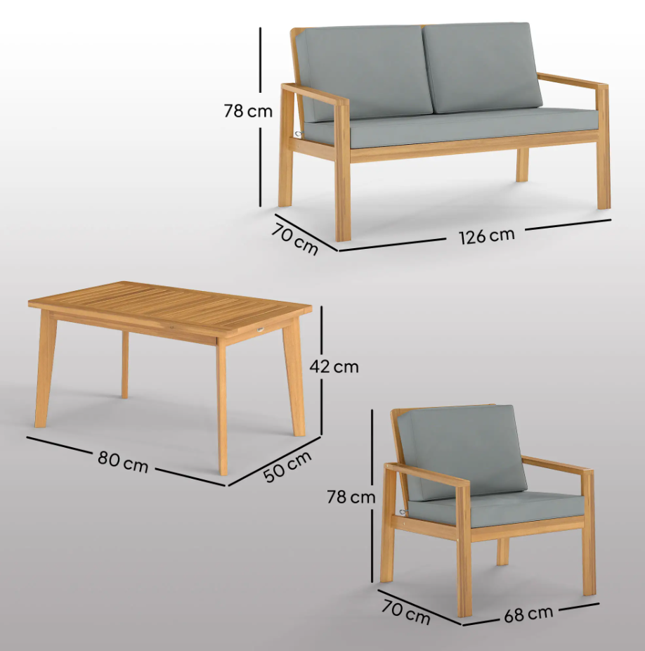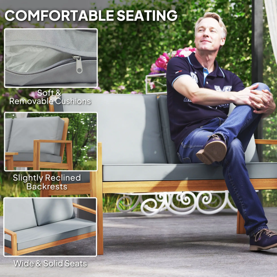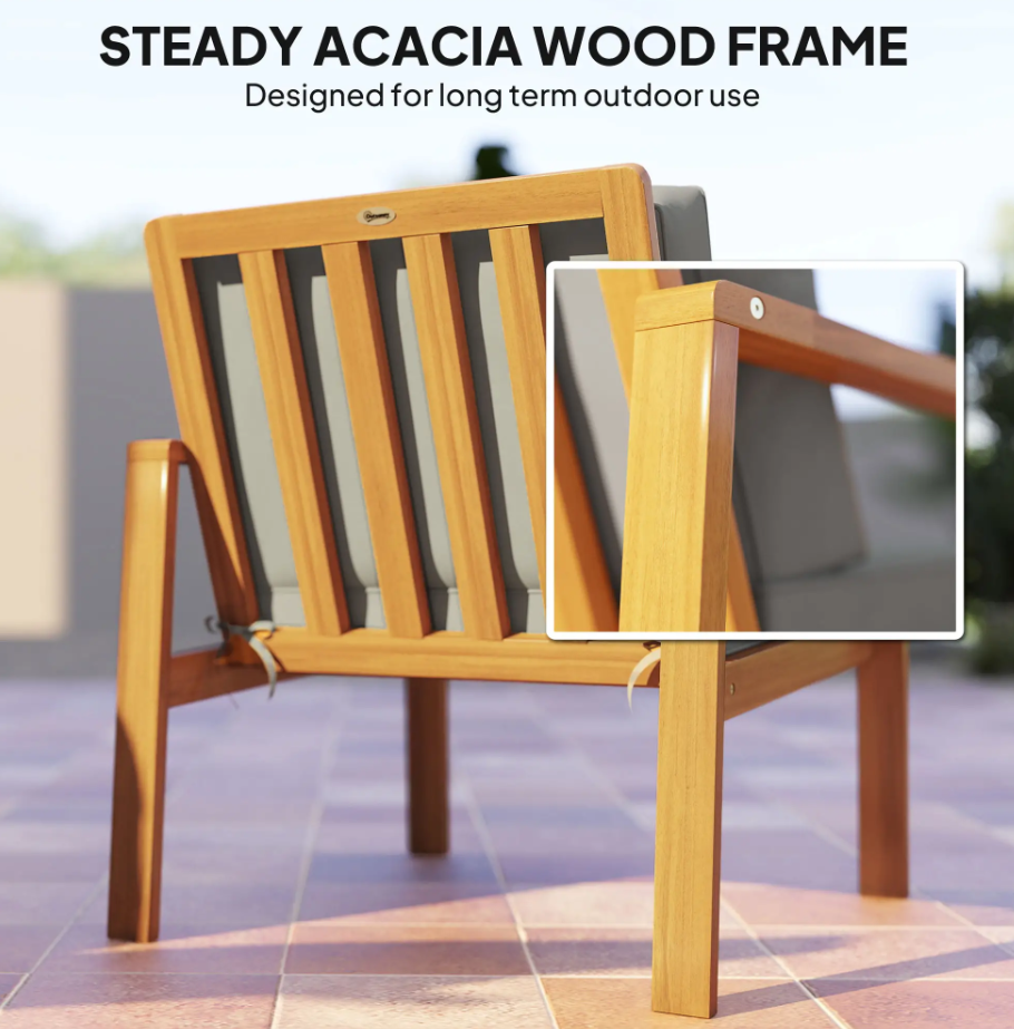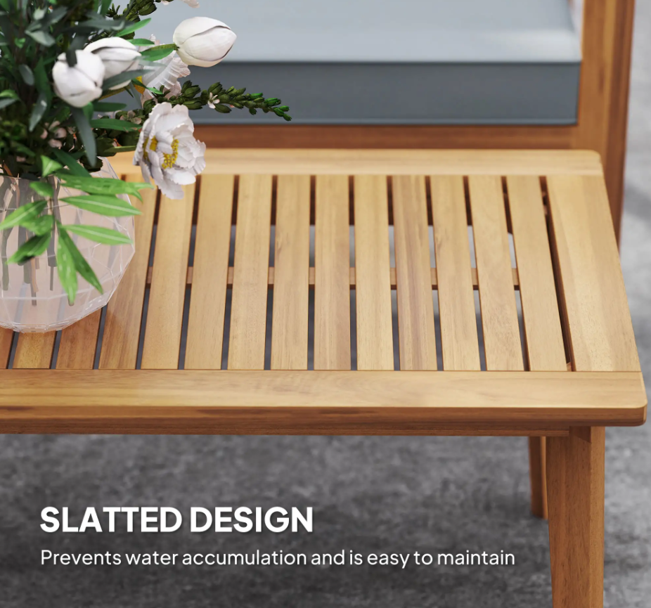 Built from solid 100% acacia wood and finished with a smooth, weather-resistant varnish coating, this Wooden Garden Furniture Set brings natural charm to any outdoor space. The soft padded cushions, reclined backrests, and extra-wide seating ensure a cozy and supportive lounging experience.