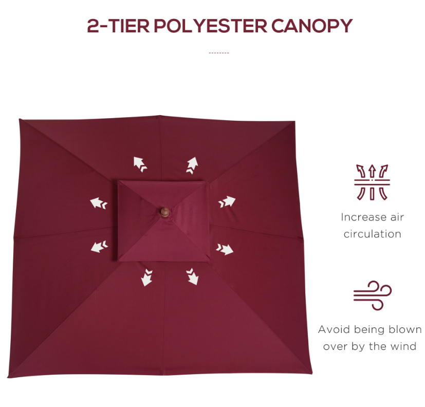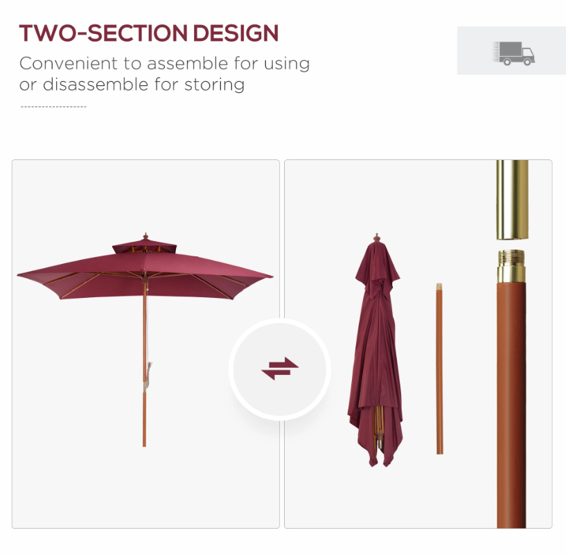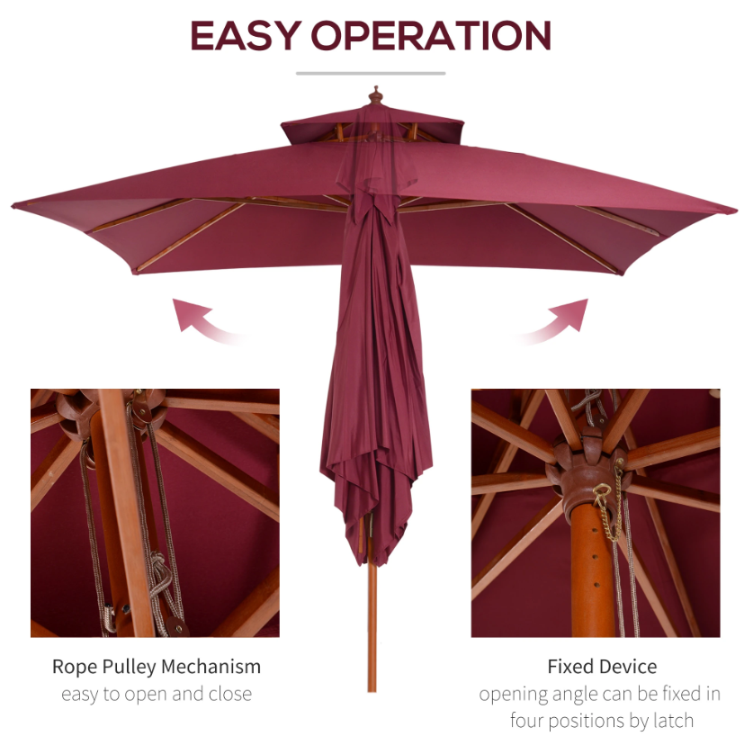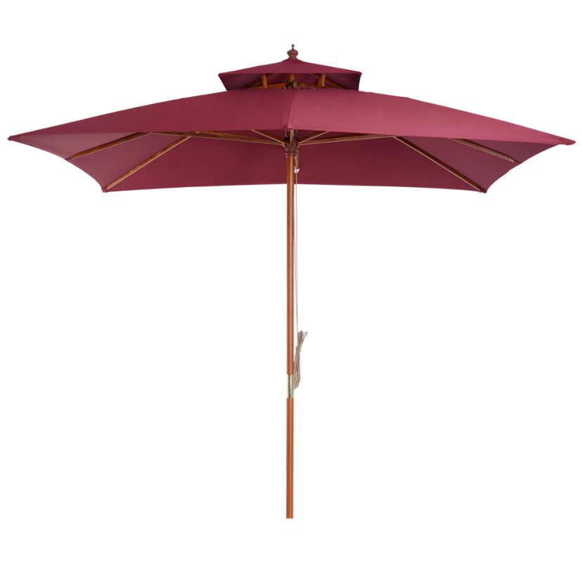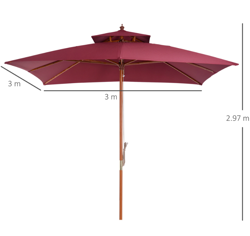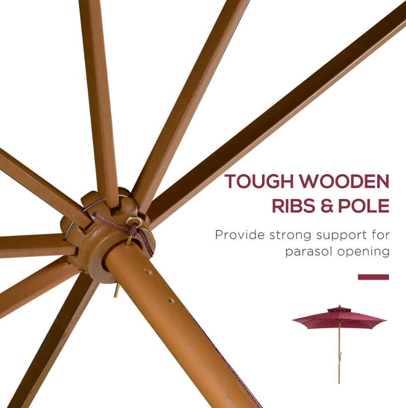 Enhance your garden or patio with this elegant 3m large outdoor Wooden Garden Parasol in a rich wine red shade – a perfect match for your outdoor furniture. Crafted with a sturdy bamboo pole and a durable 180g/m² polyester canopy, this garden umbrella offers reliable protection from direct sunlight, helping you stay cool and comfortable outdoors. Whether used as a freestanding parasol or paired with a patio dining set with a parasol hole, it adds both function and style to any outdoor setting. The easy-to-use pull rope system with a double pulley design allows for smooth opening and closing, making daily use effortless.